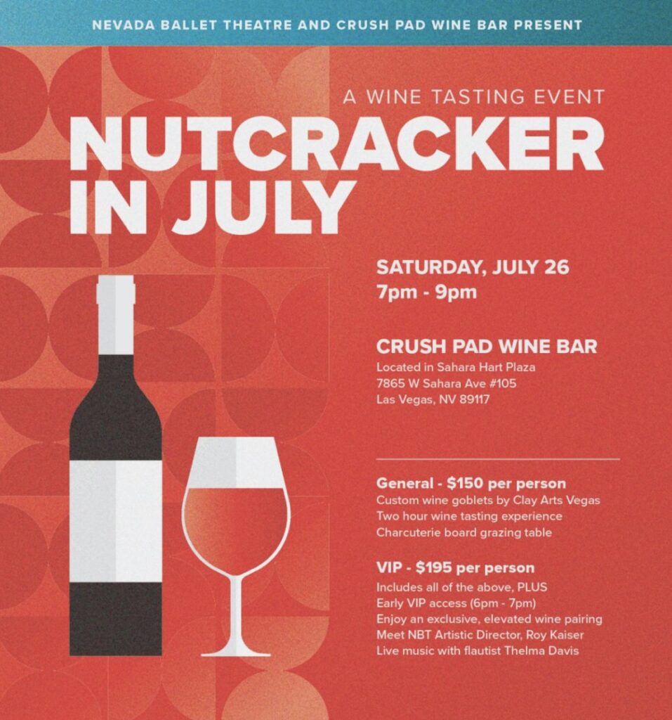 The Nutcracker in July Grand Tasting Wine Event brings the love of wine together with the joy of ballet. This celebration will support the Nevada Ballet Theatre and its upcoming redesigned production of George Balanchine’s The Nutcracker to debut in December. Crush Pad Wine Bar will be transformed into a sommelier’s playground on July 26.