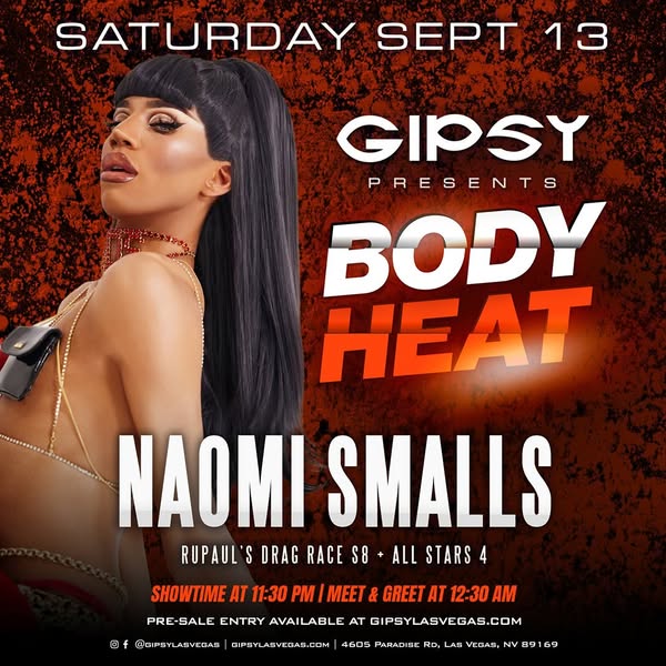 The one and only Drag Race S8 + All Stars 4 @naomismalls is bringing the heat to Gipsy Saturday, Sept. 13.