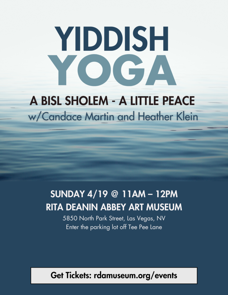 Yiddish Yoga connects creativity with well-being through a new form of movement and sound known as Yiddish Yoga A Bisl Sholem (A Bit Of Peace) on Sunday, April 19, from 11 a.m. to noon at the Rita Deanin Abbey Art Museum. The session provides an opportunity for participants to slow down, regroup, and redefine themselves through a deliberate combination of yoga and music.
