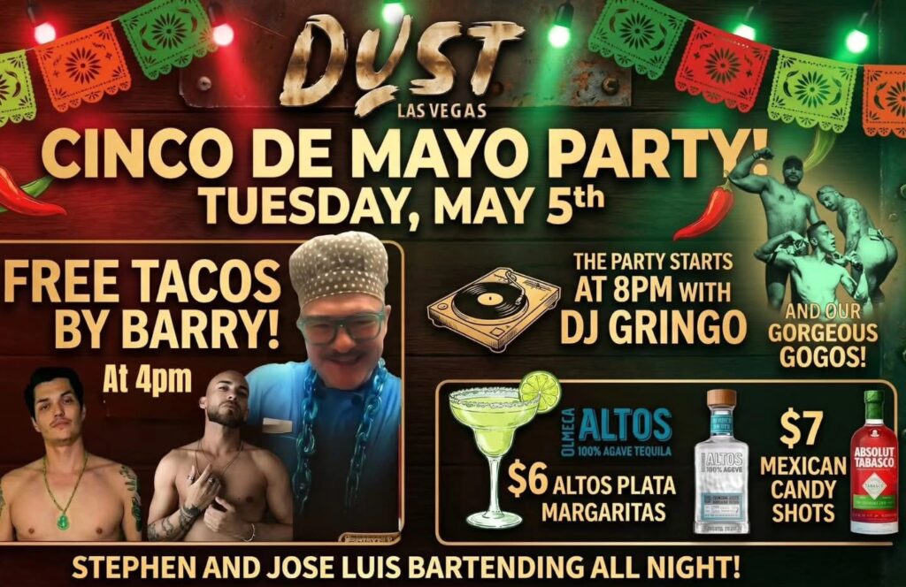Dust Las Vegas is ready for Cinco de Mayo! They are having a special Dinner with Barry on Tuesday, May 5…FREE TACOS at 4 p.m. Afterward, our big Cinco de Mayo Party starts at 8 p.m. $6 Altos Platas Margaritas! $7 Mexican Candy Shots! $25 Corona & Modelo Buckets Top 40 and Latin Music from DJ GRINGO…and Gorgeous Gogos return! Mark your calendars for Cinco de Mayo at Dust Las Vegas!
